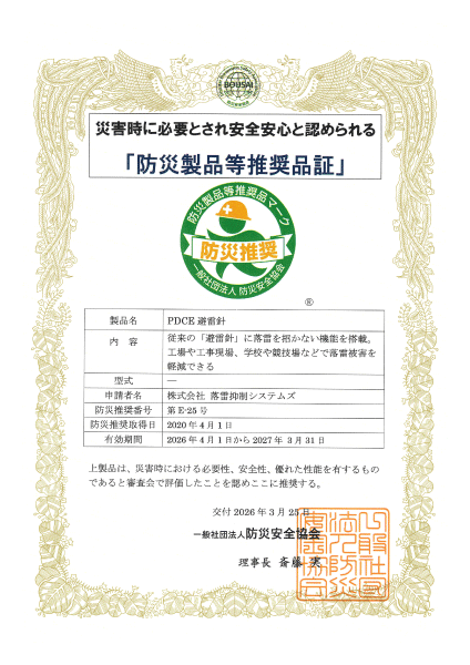 | 落雷保護 エリア | スポット的保護 (垂直軸より最大60度) | 通常避雷針エリア (高低差×2.5:最大半径50m) | 通常避雷針エリア (高低差×2.5:最大半径50m) | 通常避雷針エリア (高低差2.5:最大半径50m) | 広範囲(建築基準適用外の時) (高低差×6:最大半径70m) | 広範囲(建築基準適用外の時) (高低差×5 : 最大半径100m) | 広範囲(建築基準適用外の時) (高低差×5 : 最大半径100m) | 広範囲(建築基準適用外の時) (高低差×5 : 最大半径100m) | 広範囲(建築基準適用外の時) (高低差×6:最大半径120m) |